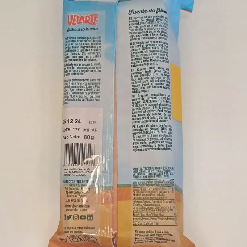 Sie werden mit ganzen Sonnenblumenkernen, welche ihnen den wunderbaren Geschmack hinzufügen, zubereitet. Sie sind goldbelb und knursprig. Die Brotstangen mit Sonnenblumenkernen sind lang und flach. Unsere Brotstangen sind 100% natürlich, ohne Zusatz von Farb- und Konservierungsmitteln.