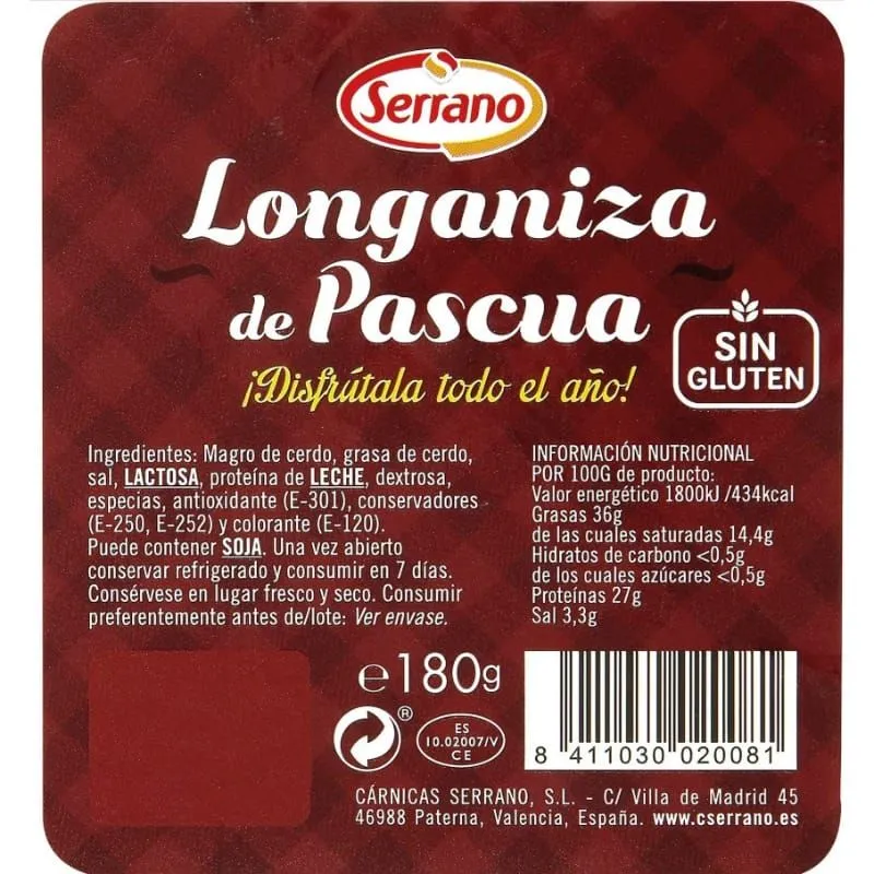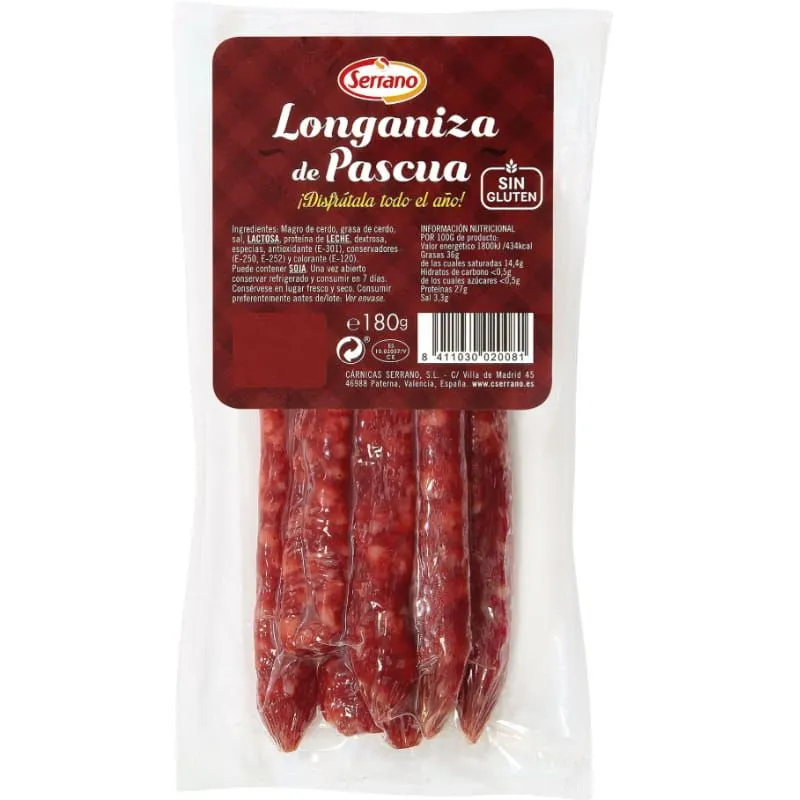 Die Longaniza de Pascua ist eine typische Wurst der spanischen Tradition, die die Qualität mageren Schweinefleischs mit einer Prise Gewürzen und einem Reifungsprozess kombiniert, der ihr einen unverwechselbaren Geschmack verleiht. Die Marke Serrano sorgt dafür, dass jedes Stück mit Liebe hergestellt wird und folgt dabei Rezepten, die von Generation zu Generation weitergegeben wurden.