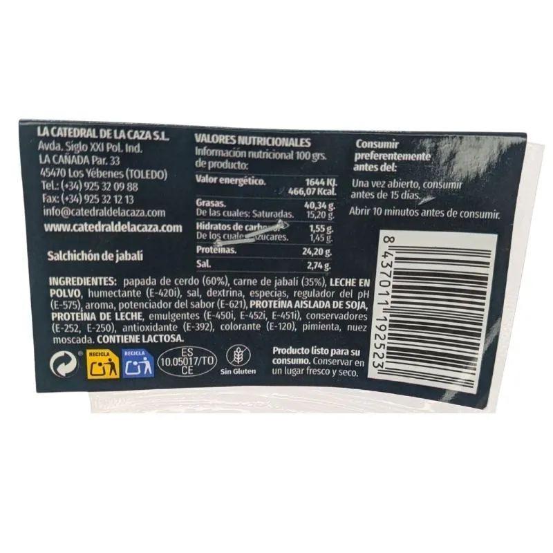 - Mageres Wildschwein (60%), Schweinebauch (35%), MILCHpulver, Feuchthaltemittel (E-420i), Kochsalz, Dextrin, Dextrose, Gewürze, pH-Regulator (E-575), Aroma, Geschmacksverstärker (E-621 ), isoliertes SOJAprotein, MILCHprotein, Emulgatoren (E-450i, E-452i, E-451i), Konservierungsmittel (E-252, E-250), Antioxidationsmittel (E-392), Farbstoff (E-120), natürlich Gewürze