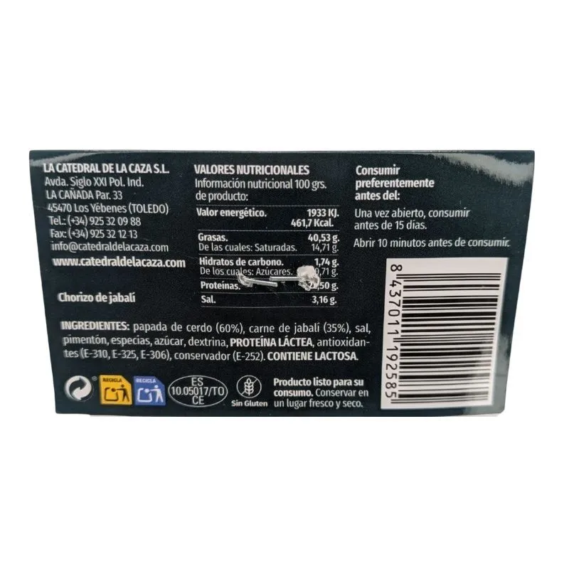 Die Wildschwein-Chorizo Wurst, die wir in unserem Online-Shop anbieten, stammt von Catedral de la Caza, einem Unternehmen mit Sitz in Toledo, das bereits mehrere Jahre in Folge mit dem Preis ,,Gran Selección" für Wildfleisch von Hirschen und Wildschweinen ausgezeichnet wurde.