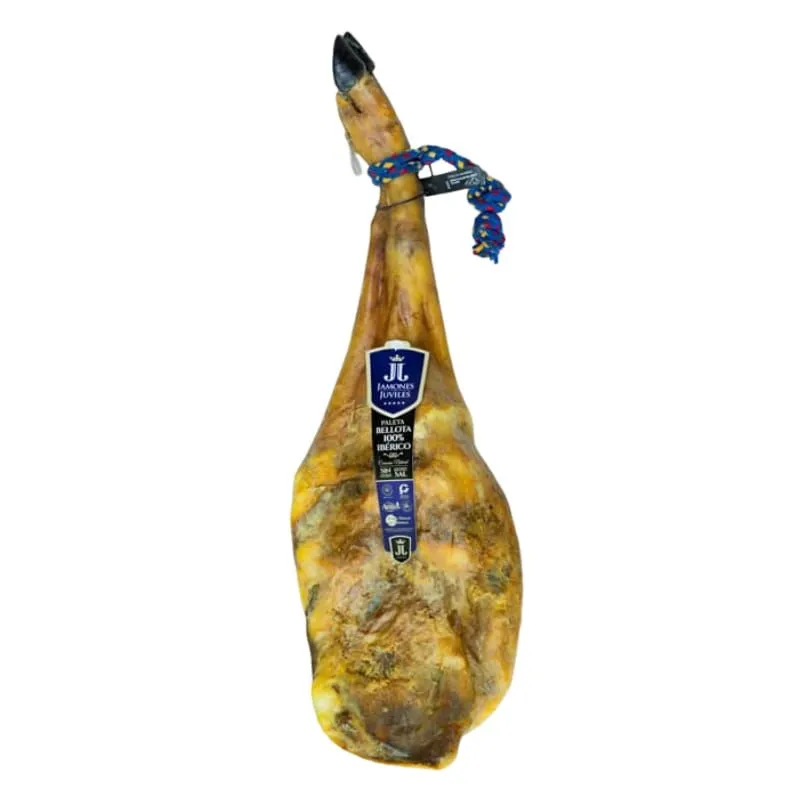 The 100% Iberian Acorn Shoulder Jamones de Juviles is a handcrafted product cured for over two years, ensuring exceptional flavor and aroma. This shoulder comes from Iberian pigs fed on acorns, giving the meat a juicy texture and a unique flavor profile.