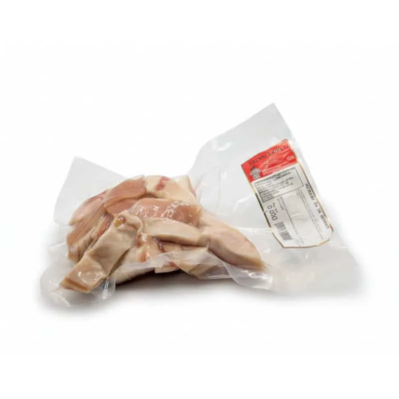The pork white bacon is presented in strips of 1cm of thickness and a length of at least 15cm. It weights about 500gr. and is vacuum packed. The bacon is obtained from the skin of the pig, it is composed of the skin itself and the superficial layer of pork fat. It is a raw product which needs to be cooked for consumption.