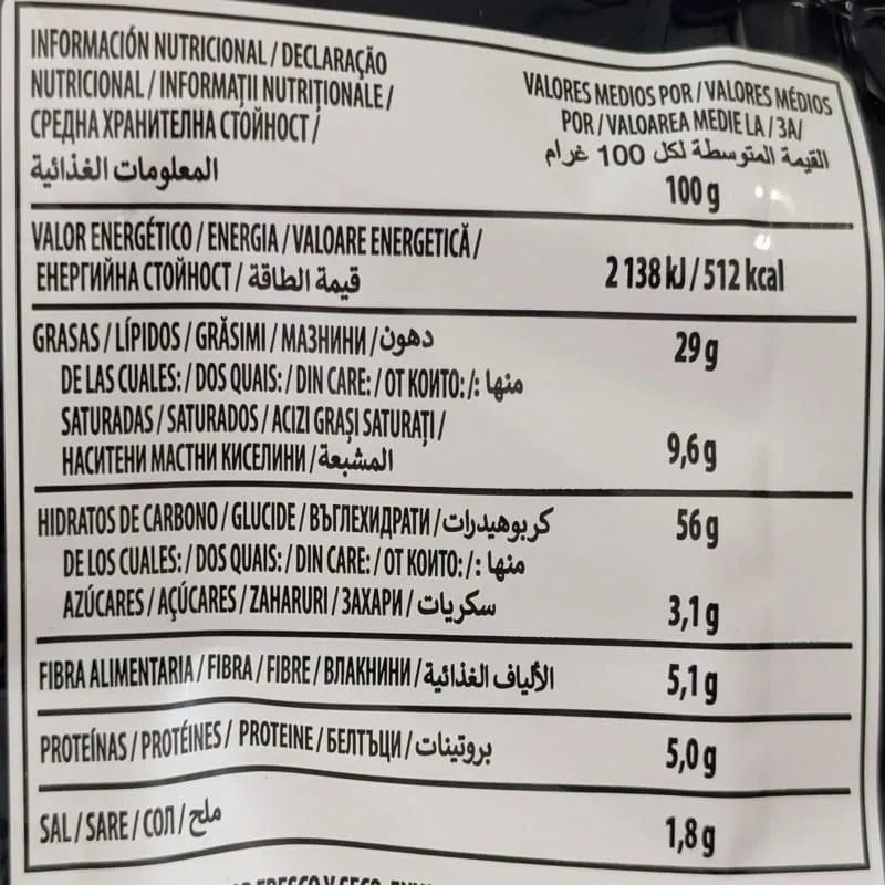 - Precooked corn flour, vegetable fat (palm), prepared seasoning with habanero chili, cucumber and lime flavour [maltodextrin, salt, acidity regulators (citric acid, sodium acetates), flavourings, flavour enhancers (potassium chloride, disodium 5’-ribonucleotides), dextrose, sugar, dehydrated glucose syrup, safflower concentrate, colouring foodstuff (spirulina extract), onion powder, colour (Brilliant Blue FCF)], vegetable oil (sunflower).