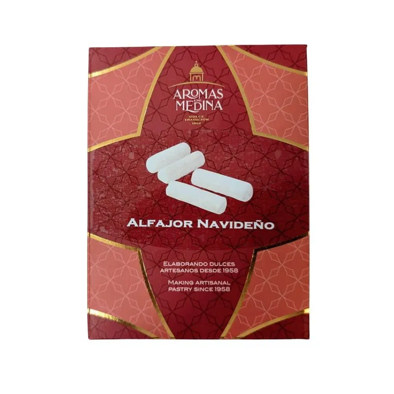 Alfajores Aromas de Medina are made with carefully selected ingredients to ensure an authentic and traditional flavor. They contain wheat flour, sugar, lard (pork fat and antioxidant BHA), almonds, cinnamon, potato starch, anise seed, clove, and vanilla flavoring. This combination creates the perfect mix of textures and aromas reminiscent of Christmas. The alfajores contain almonds and gluten, and may contain traces of sulfites, other tree nuts, sesame, egg, milk derivatives, soy, mustard, and peanuts, so caution is advised for people with allergies.