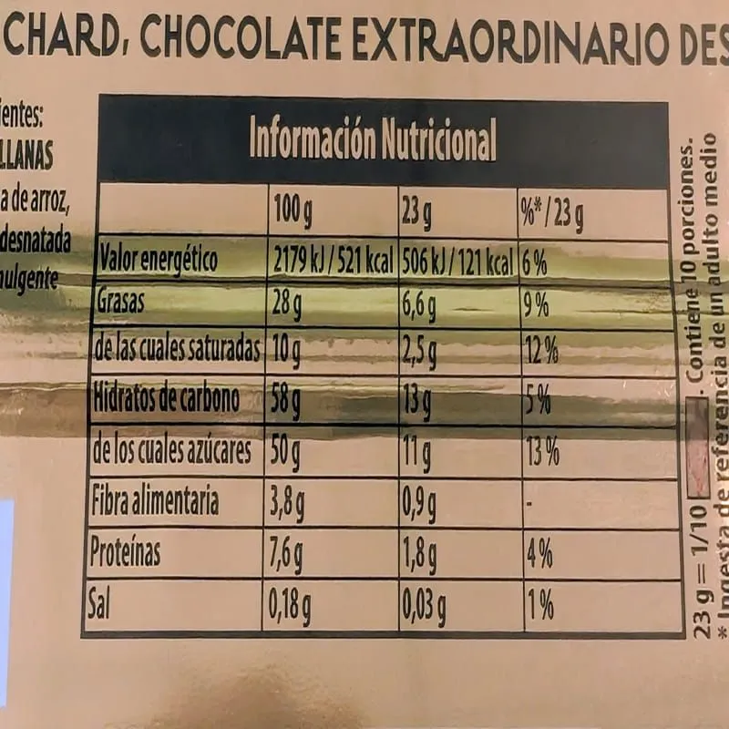 - Sugar, nuts (ground ALMONDS, ground HAZELNUT), cocoa butter, puffed rice 9% [rice flour, sugar, salt, emulsifier (E471)], cocoa mass, skimmed MILK powder, whey powder , MILK fat, emulsifier (SOYA lecithin), natural flavor. With milk chocolate. MAY CONTAIN WHEAT