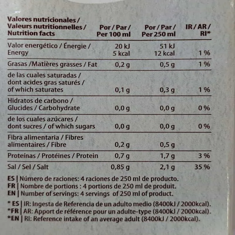 -Ingredientes: El caldo está hecho con agua, carnes (13%) (pollo, carne de vacuno, carne de cerdo), hortalizas en proporción variable (3%) (cebolla, zanahoria, col, apio, ajo), garbanzos (0,8%), sal, jamón curado (0,4%) [jamón de cerdo, sal], manteca de cerdo, aroma natural, especias, chorizo (0,05%) [carne de cerdo, tocino, pimentón, colorante (extracto de pimentón), sal, dextrosa, ajo, antioxidante (isoascorbato de sodio), canela], manteca de cerdo curada [manteca de cerdo, sal].