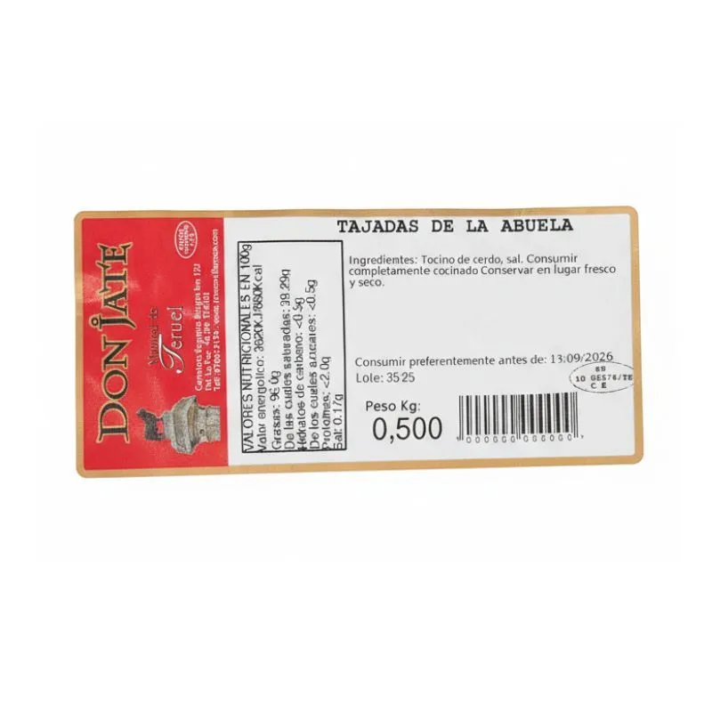 Este producto también es conocido como torreznos o tajadas de cerdo. Lo elabora la empresa Don Jate, una empresa turolense especializada en elaborar productos del cerdo. El torrezno o tocino es un producto considerado como casquería, que se consideran aquellos que se obtienen de partes de los animales que por lo general se suelen desechar, como las orejas, el morro, la careta, las criadillas o la propia piel.