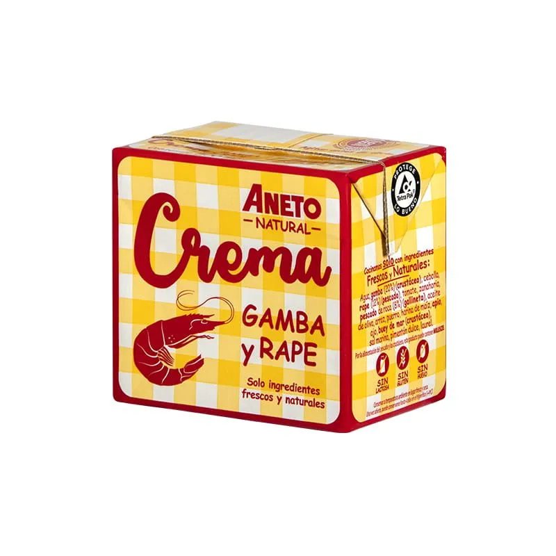 Lo que hace realmente especial a esta crema son sus ingredientes frescos y naturales. En su receta encontrarás agua, gamba (20%) (crustáceo), cebolla, rape (12%) (pescado), tomate, zanahoria, pescado de roca (8%) (gallineta), aceite de oliva, arroz, puerro, harina de maíz, apio, ajo, buey de mar (crustáceo), sal marina, pimentón dulce y laurel. Todos ellos se combinan de manera equilibrada para lograr un sabor profundo y auténtico, sin necesidad de añadidos artificiales.