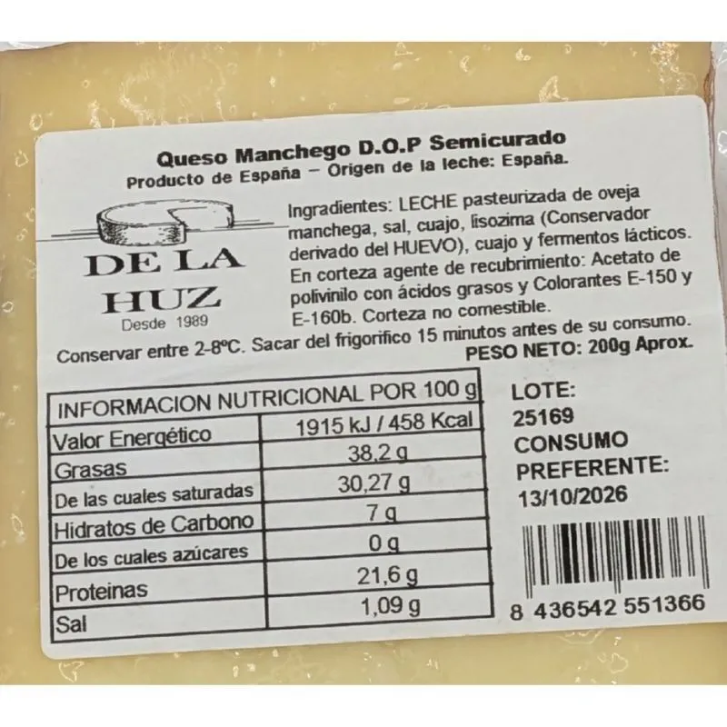 - Leche pasteurizada de oveja manchega, sal, cloruro cálcico, lisozima (conservador derivado del huevo), cuajo y fermentos lácticos. En corteza: agente de recubrimiento a base de ácidos grasos. Acetato de polivinilo y colorante (E-150a y E-160b (ii)). Corteza no comestible.