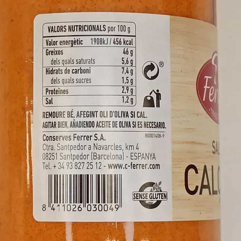 La salsa calçots se elabora, de forma tradicional, a base de tomates asados, ajos asados, almendras y aceite. Los ingredientes están bien ligados y la salsa queda muy cremosa. El equilibrado sabor a tomate y almendra tiene un toque muy sutil de ajo. Nuestra salsa calçots es 100% natural, sin colorantes ni conservantes añadidos.