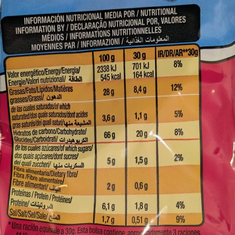 - Sémola de maíz (68%), aceite de girasol (29%), aromas [sustancias aromatizantes, sustancias aromatizantes naturales, lactosuero (contiene leche y sus derivados), potenciador del sabor (glutamato monosódico E-621 y sal].