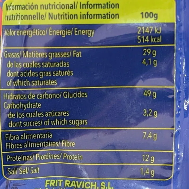 - Productos de aperitivo fritos (29%) (maíz, aceite de girasol), cacahuete frito y salado (26%) (cacahuetes, aceite de girasol, sal), maíz frito (26%) (maíz, aceite de girasol), producto de aperitivo frito con sabor a barbacoa (15%) [maíz, aceite de girasol, sal, aroma, maltodextrina de maíz, potenciadores del sabor (E-621, E-635), aroma de humo, acidulante (E-330)] y aroma salsa teriyaki wasabi (4%) [aroma, azúcar, sal, maltodextrina de maíz, corrector de acidez (E-330), colorante (E-160c), edulcorante (E-951)].