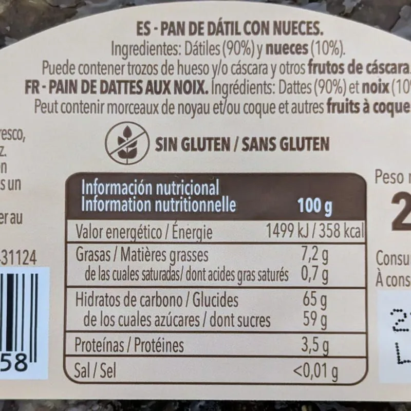 El Pan de Dátil de Frit Ravich destaca por su simplicidad y pureza, ya que está elaborado con ingredientes seleccionados para garantizar la máxima calidad. Su composición es muy sencilla: 90% dátiles y 10% nueces.
