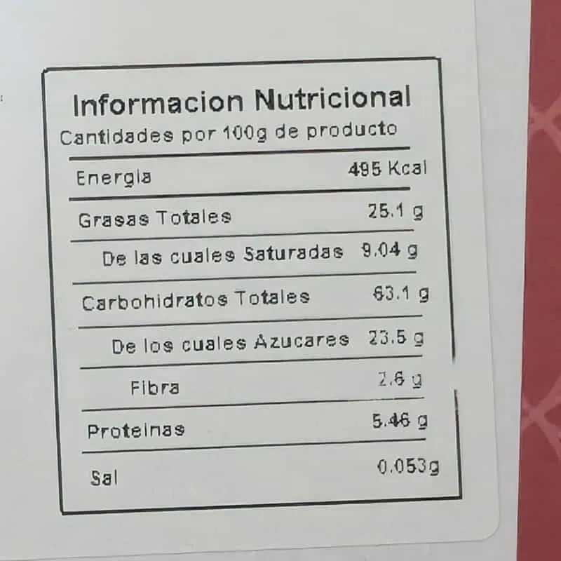 - MANTECADO ALMENDRA: Harina de trigo, manteca (grasa de cerdo y antioxidante BHA), azúcar, almendra (7%), canela y aromas. Decoración: sésamo; ROSCO DE VINO: Harina de trigo, manteca (grasa de cerdo y antioxidante BHA), azúcar, vino (7%) (sulfitos), canela, semilla de anís, clavo, sal y aromas.; ALFAJOR NAVIDEÑO: Harina de trigo, azúcar, manteca (grasa de cerdo y antioxidante BHA), almendras, semilla de anís, canela, clavo y aroma de vainilla.; POLVORÓN ALMENDRA: harina de trigo, manteca (grasa de cerdo y antioxidante BHA), azúcar, almendra (6,75%), canela, semilla de anís, clavo y aromas.
