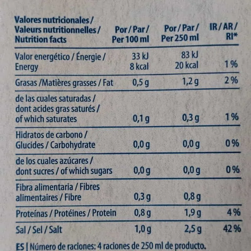 - Eau, crevette (Pleoticus muelleri) (5,4%) [crevette (crustacé), conservateurs (métabisulfite de sodium)], concentré de tomate, légumes en proportion variable (1,3%) (oignon, ail, carotte, céleri), sel, arôme naturel (poisson, crustacés), huile de tournesol, huile d’olive vierge extra (0,1%), épices, ñora.