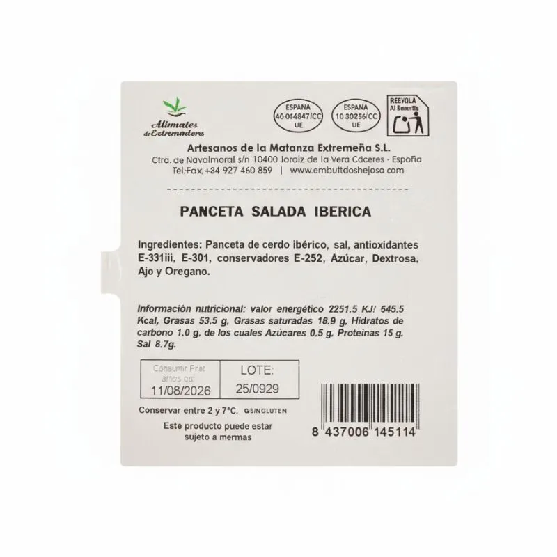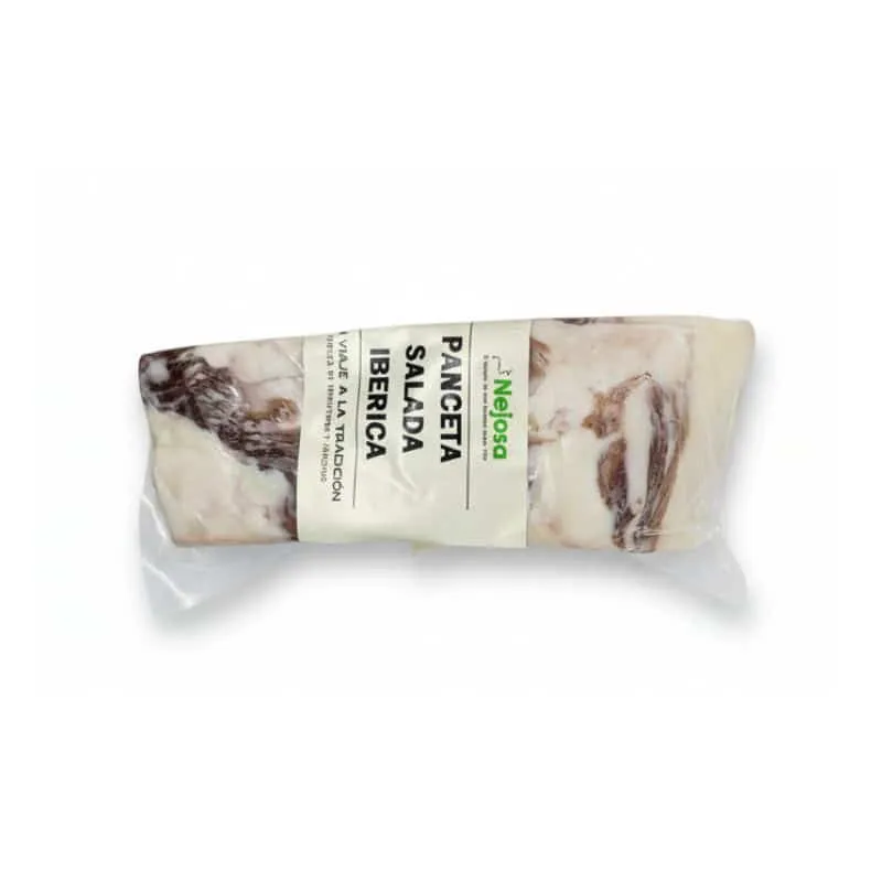 Notre lard ibérique salé provient de porcs d’une race ibérique d’au moins 50 %. Il est élaboré par l’entreprise familiale Embutidos Nejosa et est présenté au format 400 gr., emballé sous vide. 50 %
