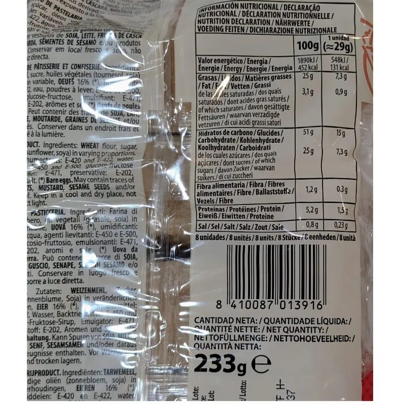 - Farine de blé, sucre, huiles végétales (tournesol, soja) en proportion variable, œufs (16 %), agents humectants : E-420 et E-422, eau, agents levants : E-450 et E-500, sirop de glucose-fructose, émulsifiant : E-471, conservateur : E-202, arômes et sel.