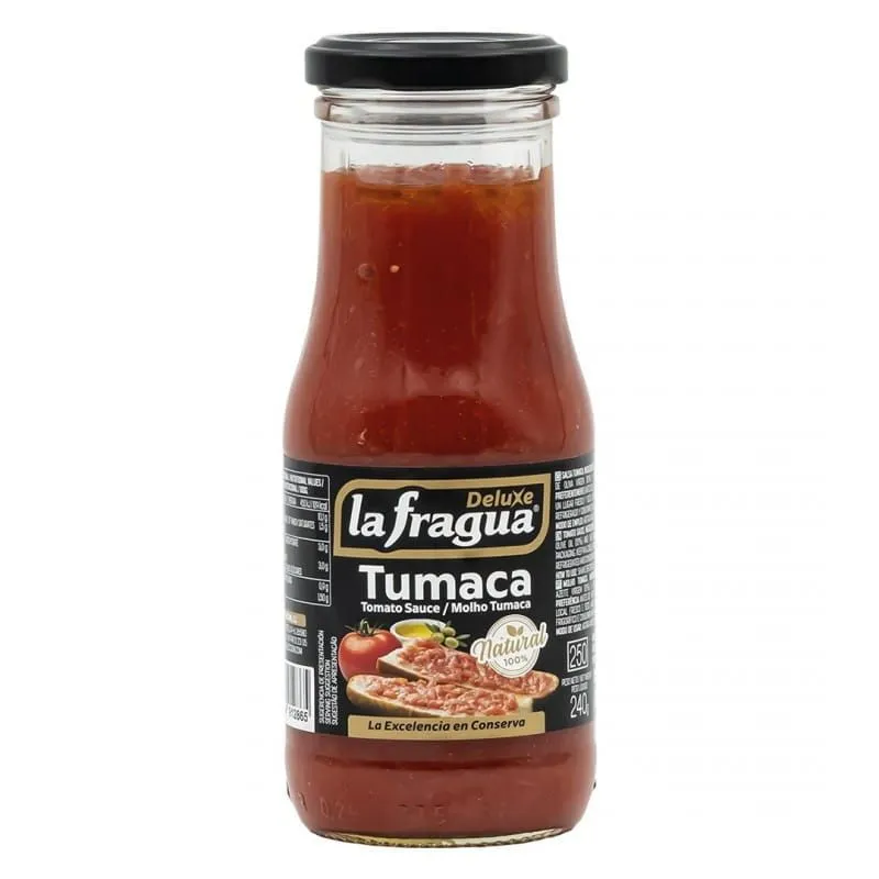 La recette de la Tomate Râpée Tumaca est simple, naturelle et de la plus haute qualité, suivant la philosophie de La Fragua Deluxe de proposer des produits gourmet authentiques. Elle est préparée avec des tomates, soigneusement sélectionnées pour garantir une saveur intense et fraîche ; de l’huile d’olive vierge, apportant douceur et une touche méditerranéenne ; et une pincée de sel, suffisante pour relever les saveurs sans altérer la pureté de la tomate. Rien de plus, sans additifs ni conservateurs inutiles, ce qui en fait un produit sain et délicieux, prêt à être dégusté directement du pot.