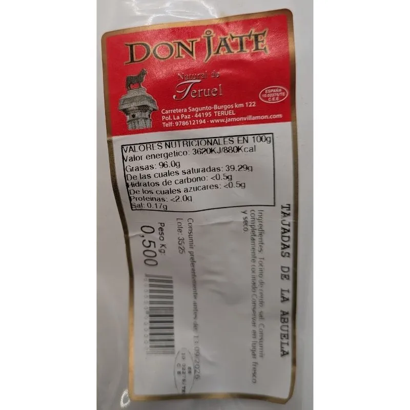 Ce produit est également connu sous le nom de torreznos ou tranches de porc. Il est fabriqué par l'entreprise Don Jate, une entreprise de Teruel spécialisée dans les produits de porc. Le torrezno ou lard est un produit considéré comme un abats, c'est-à-dire ce qui est obtenu à partir de parties d'animaux habituellement jetées, comme les oreilles, les groins, les museaux, les croupions ou la peau elle-même.