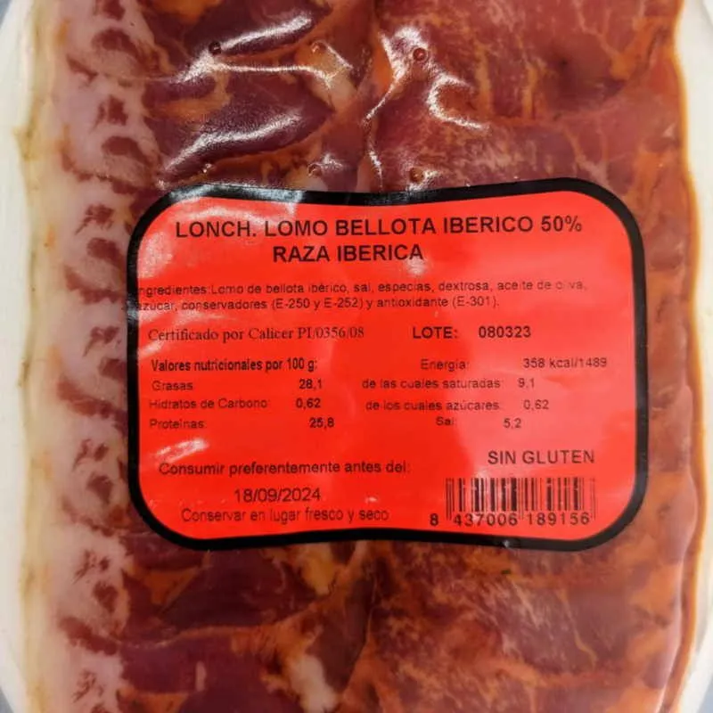 Lomo de bellota 50% iberico. Het komt van Iberische varkens, die vrij rondlopen en gevoed worden met eikels.