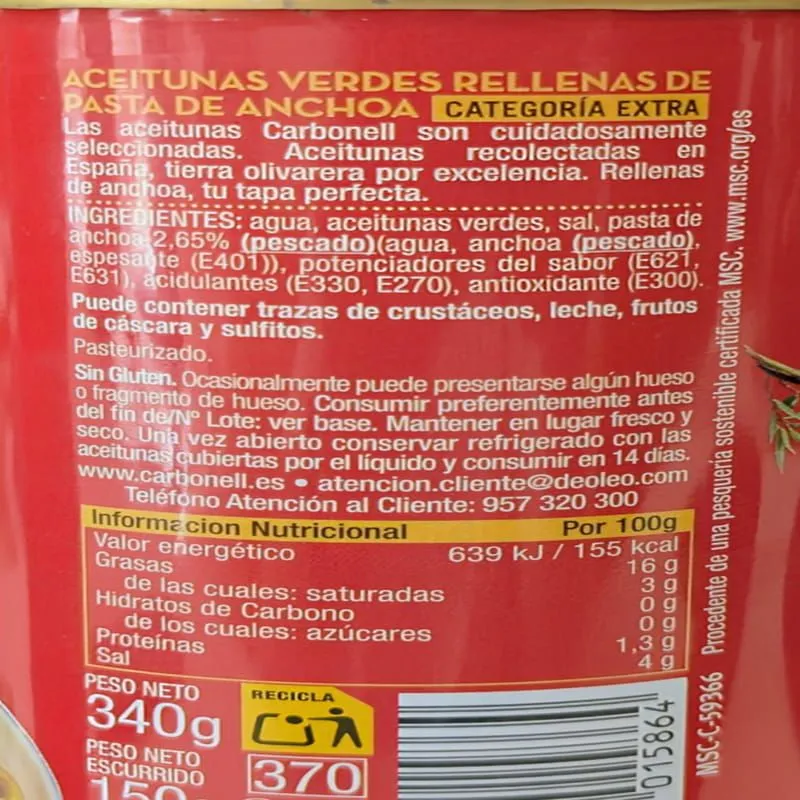 - Water, groene olijven, zout, ansjovispasta (2,65 %) (vis) (water, ansjovis (vis), verdikkingsmiddel (E-401)), smaakversterkers (E-621, E-631), zuurteregelaars (E-330, E-270), antioxidant (E-300).