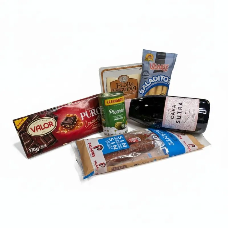 Je vindt de Flor de Esgueva kaas van 250 gr., een volle en smaakvolle kaas die perfect combineert met wijn of om zo van te genieten; de knapperige Velarte Saladitos, ideaal om te snacken terwijl je proost; de Cava Sutra Brut Rosa Etiket, verfrissend en elegant, perfect voor een speciale toast; de Palacios Pittige Chorizo, met een authentieke smaak en een gedurfd pittig tintje dat liefhebbers van pittig zeker zal bevallen; de Puro Valor Crocanti Chocolade, zoet en knapperig om de avond af te sluiten met een onweerstaanbare traktatie; en tot slot de La Española Gevulde Jalapeño Olijven, die een smaakvol en pittig hapje toevoegen om deze unieke ervaring compleet te maken.