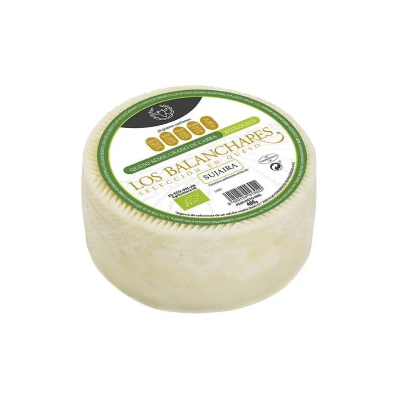 Ik wil Los Balanchares aanbieden een biologische kaas die is gemaakt met gepasteuriseerde melk van geiten van eigen kweek. Dat is het . Deze kaas weegt 400 gram en komt heel, met een diameter van ongeveer 13 cm en een hoogte van ongeveer 4 cm. Het wordt in een vacuüm verpakt met een dikke afdichting, wat zijn levensduur verlengt.