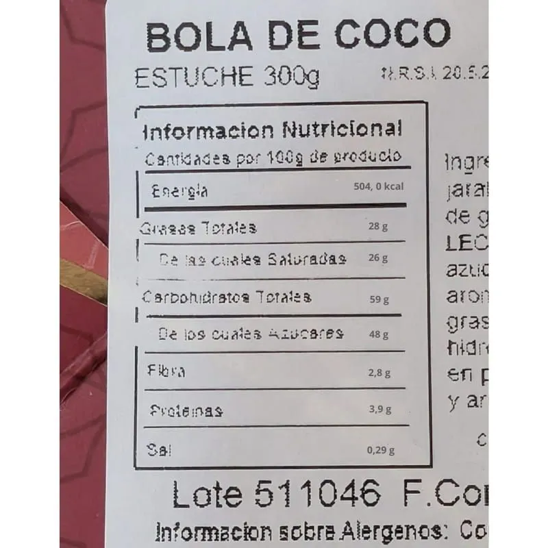 - Geraspte kokos (33%), suiker, glucosestroop, fondant (suiker, glucosestroop en water), eiwit, gecondenseerde melk (verse melk en suiker), conserveermiddel (sorbinezuur) en aroma’s. Omslag: chocolade (suiker, volledig geharde, gefractioneerde plantaardige vetten (palmkern), ontvet cacaopoeder, emulgatoren (E322 (zonnebloem), E492) en aroma’s).